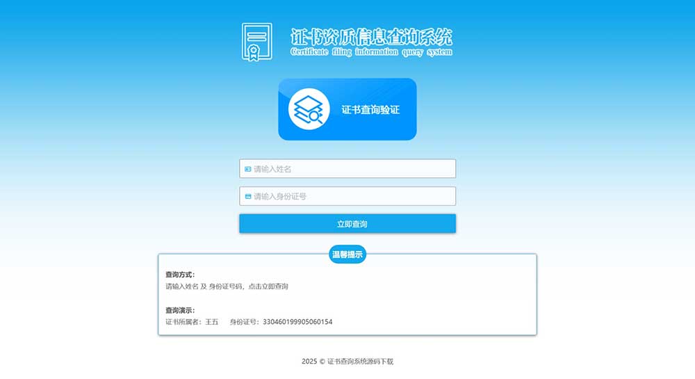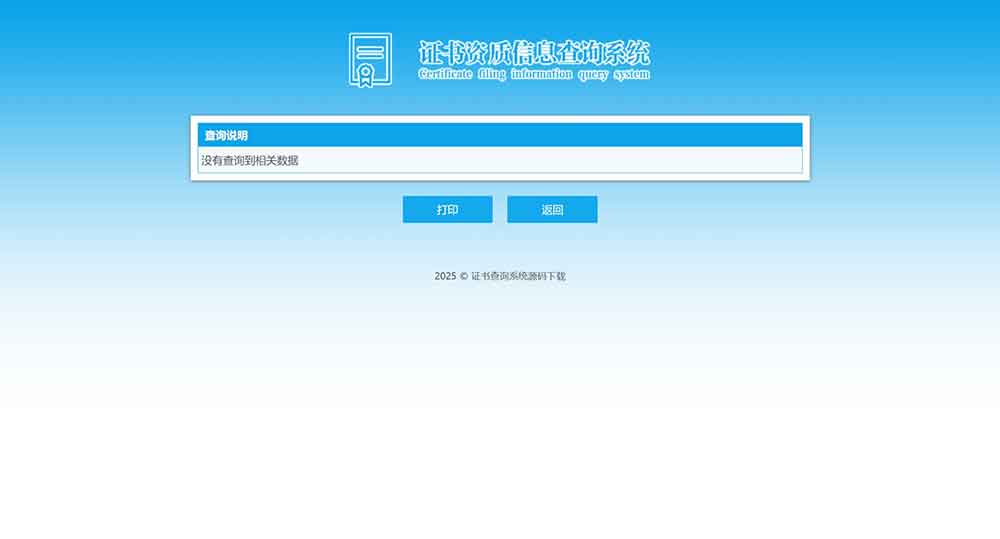 证书查询系统源码后台程序采用MIT开源协议的迅睿CMS建站版/大众版 V4.7.1制作,未修改官方核心文件,可随意同步官方升级。前端为自适应布局,后台使用官方表单系统开发制作,可实现如证书查询、资质查询、授权查询等单条内容查询功能,查询成功直接跳转显示结果,支持创建自定义字段。禁止通过表单ID链接直接访问,保护隐私,只有通过搜索才能查看,防止通过表单ID查看证书详情。