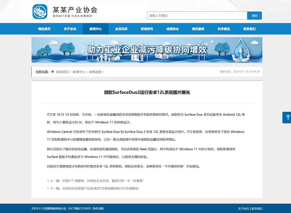 蓝色商协管理类网站模板,前端为自适应布局,底部友情链接可以按分类调用,适合用于政府机构、行业协会等站点。页面模板包括:首页、栏目单页、新闻列表及详情页面、搜索结果页、404页、提示信息页。后台程序采用迅睿CMS原版程序制作,预装了网站地图插件,基本上前端所有内容都可以在后台修改。程序安装后附带测试数据,新手也可快速上手使用。