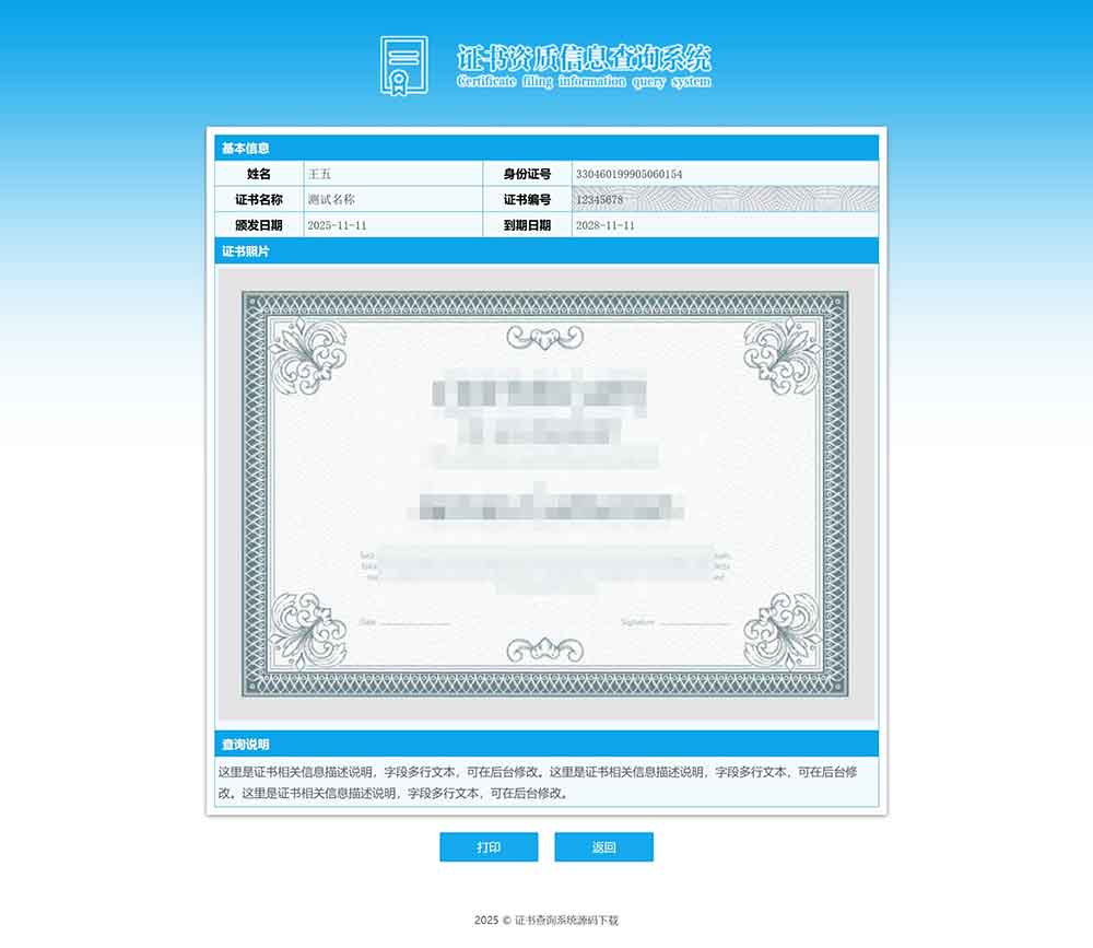证书查询系统源码后台程序采用MIT开源协议的迅睿CMS建站版/大众版 V4.7.1制作,未修改官方核心文件,可随意同步官方升级。前端为自适应布局,后台使用官方表单系统开发制作,可实现如证书查询、资质查询、授权查询等单条内容查询功能,查询成功直接跳转显示结果,支持创建自定义字段。禁止通过表单ID链接直接访问,保护隐私,只有通过搜索才能查看,防止通过表单ID查看证书详情。