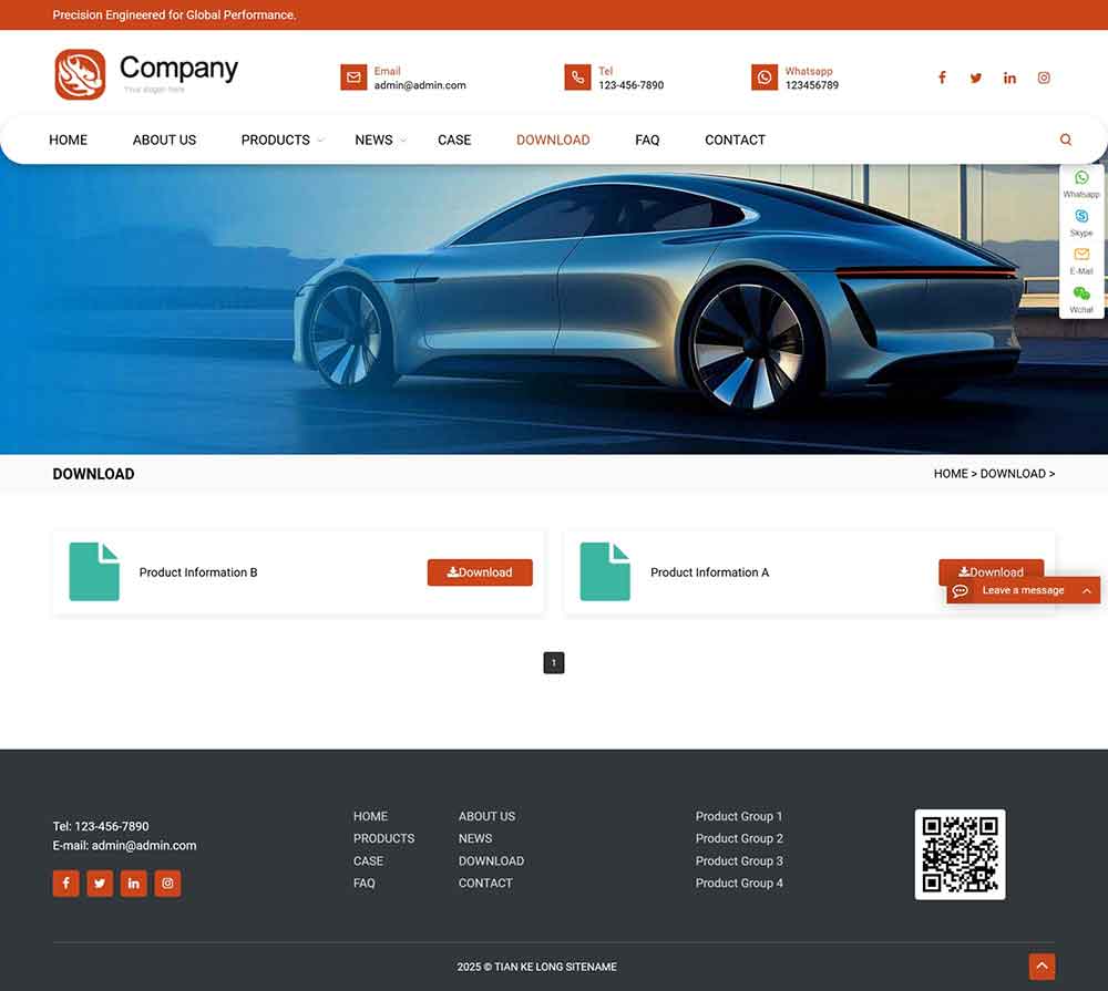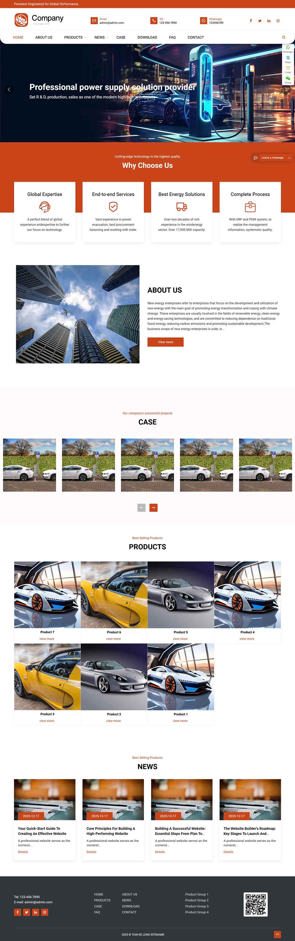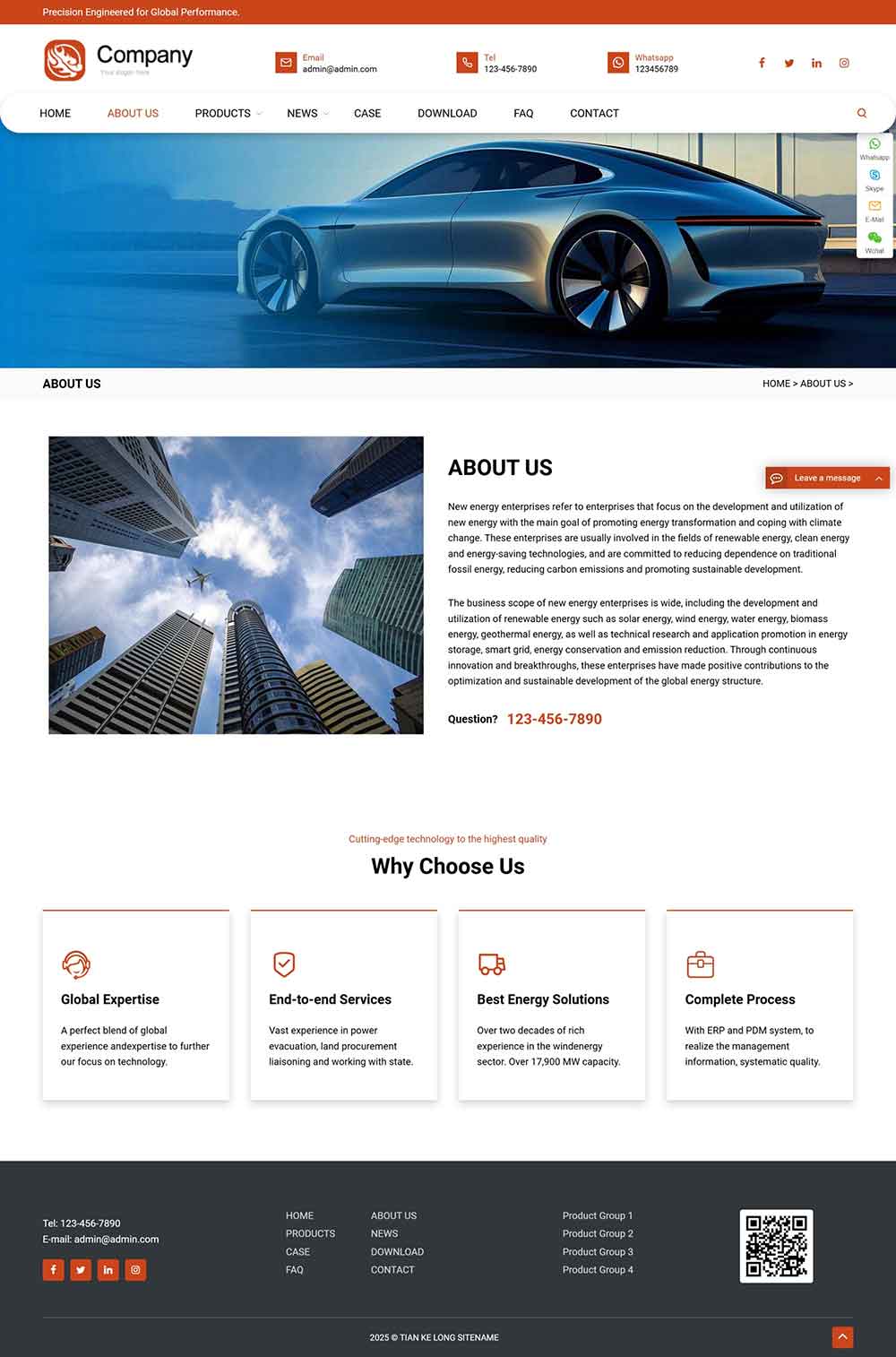 外贸企业公司展示型英文网站模板,后台程序使用MIT开源协议的迅睿CMS建站版/大众版 V4.7.1制作,未修改官方核心文件,可随意同步官方升级。前端为自适应布局,PC及手机端有外贸常用的社交软件,基本上所有前端内容都可以通过后台修改。