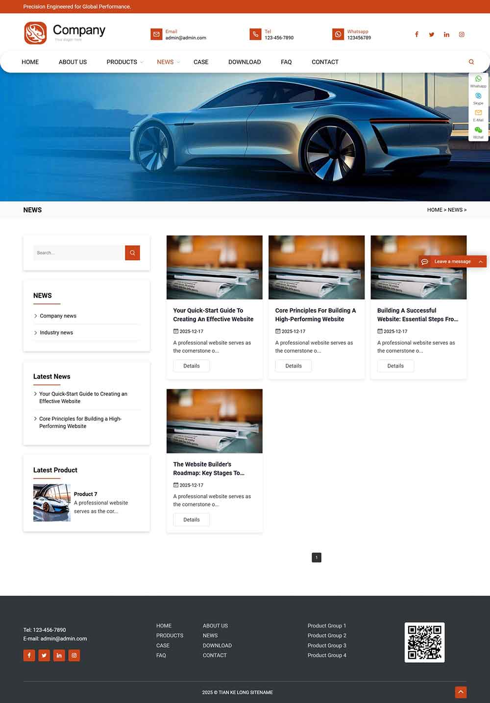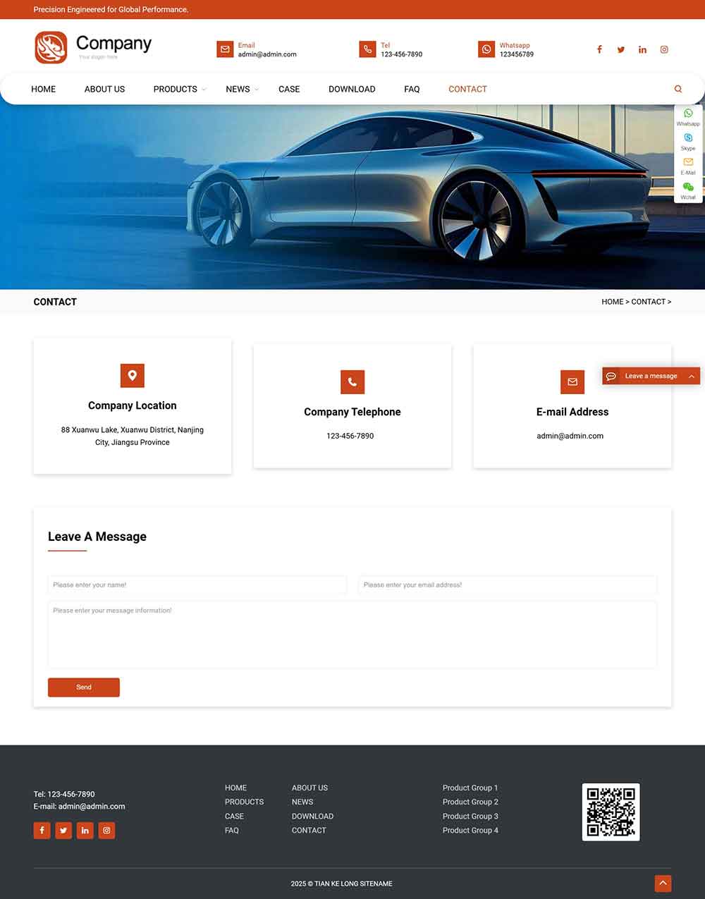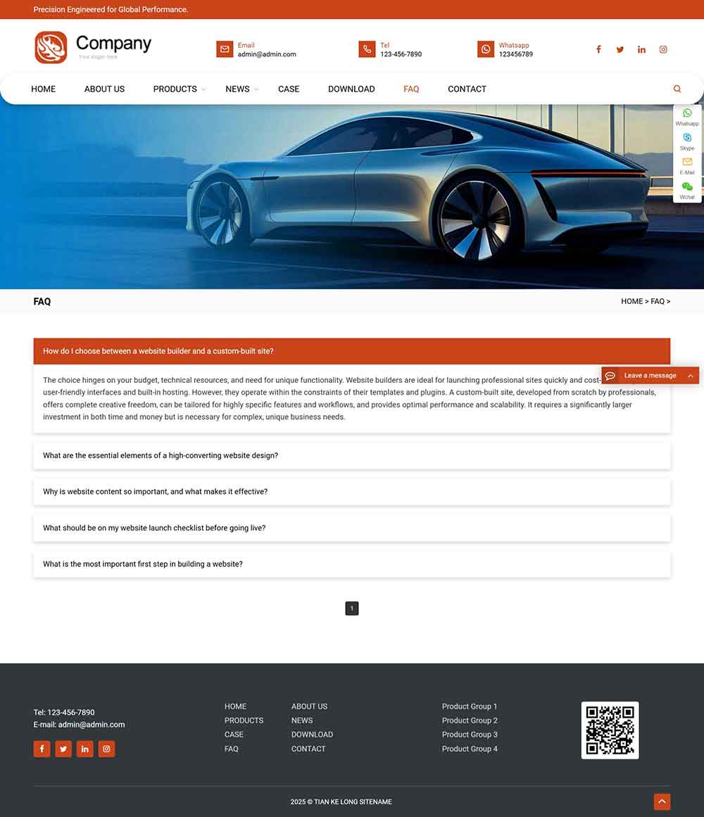 外贸企业公司展示型英文网站模板,后台程序使用MIT开源协议的迅睿CMS建站版/大众版 V4.7.1制作,未修改官方核心文件,可随意同步官方升级。前端为自适应布局,PC及手机端有外贸常用的社交软件,基本上所有前端内容都可以通过后台修改。